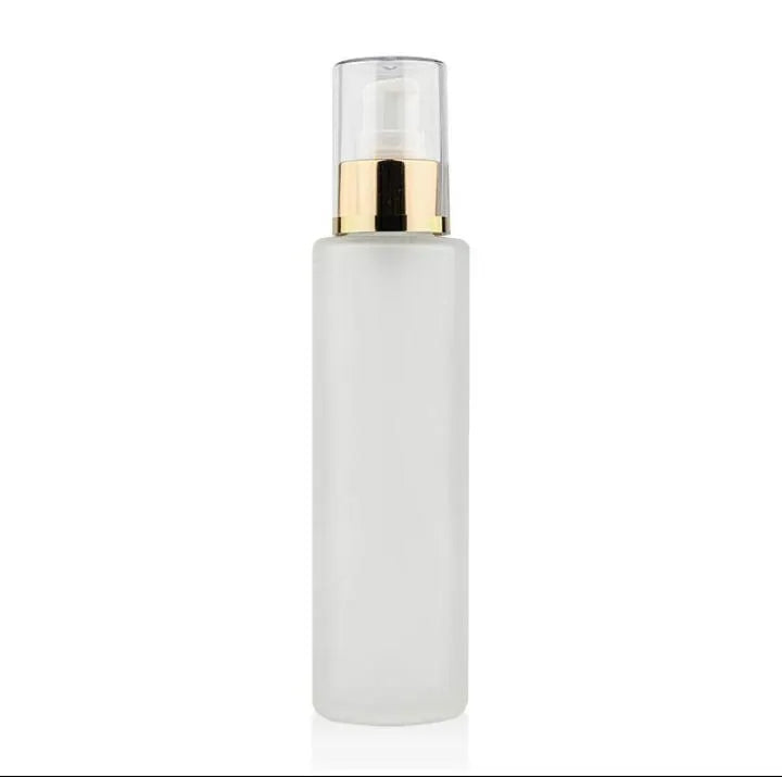 New 4oz Frosted Luxury Skincare Glass Bottle With Gold Pump/Clear Cover with Gold Line.